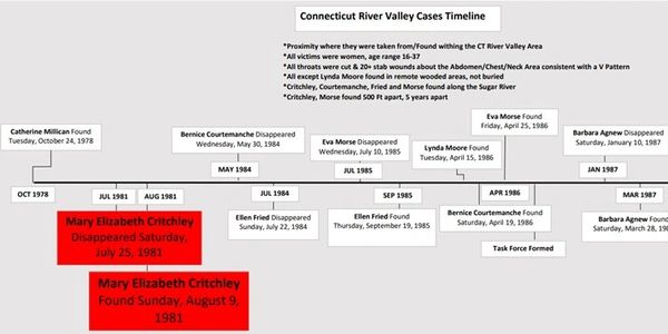 Mary Elizabeth Critchley was last seen on Saturday July 25th, 1981 near exit 13 on the Massachusetts Turnpike in Framingham Massachusetts. She was a student in Vermont and was hitchhiking to Waterbury Vermont.